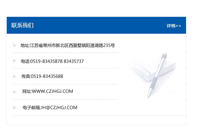 地址:常州市新北區友邦商務大廈1幢16、17層  電話:0519-85101652  傳真:0519-85112595  郵編:213022  網址:www_cz-jiayue_cn.scxdnt.com  郵箱:xiajifengaa@163.com